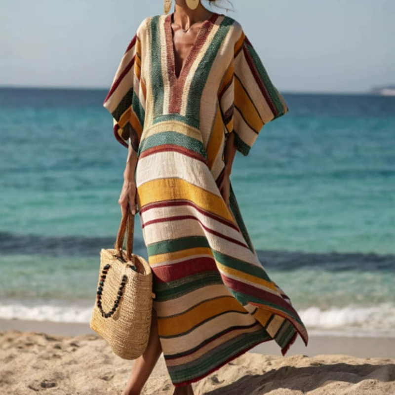 Farebné pruhované šaty s výstrihom do V a rukávmi Dolman